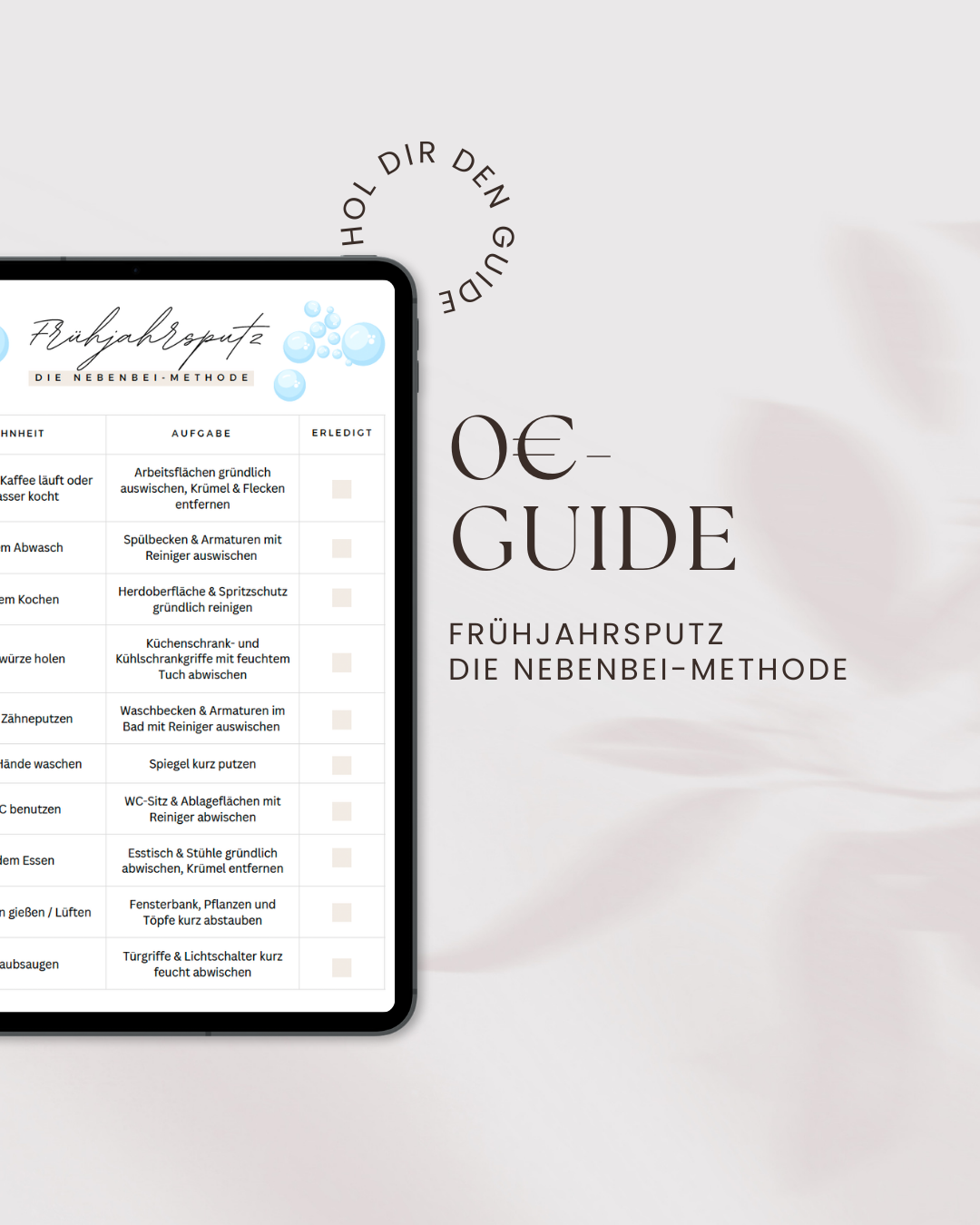 Frühjahrsputz. Haushalt nebenbei Nie wieder Putz-Marathons. So bleibt dein Zuhause automatisch ordentlich:Mit meiner Methode koppelst du kleine Gewohnheiten an Dinge, die du sowieso machst und erledigst Ordnung & Mini-Putzaufgaben nebenbei.Kennst du das?Du planst einen großen Putz, schiebst ihn auf und am Ende ist alles wieder chaotisch? 🤯Der Fehler: Ordnung als „Event“ statt System zu sehen.Die Lösung: Gewohnheiten koppeln ✅So passiert Ordnung automatisch, ohne extra Zeit oder Motivation.In meinem kostenlosen Guide lernst du:✓ Mini-Routinen einfach in deinen Alltag einbauen✓ Chaos & Stress vermeiden✓ dein Zuhause konstant ordentlich haltenDas Ergebnis:✨ weniger Chaos✨ kein Stress vor großen Putzaktionen✨ ein Zuhause, das sich immer gut anfühlt E-Mail-Adresse Hol dir den 0€-Guide Vielen Dank!